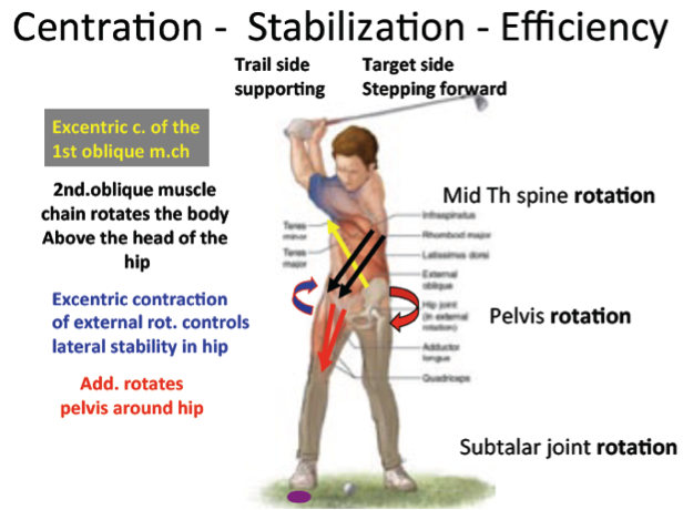 The support and stepping forward extremities always perform in equal but opposite movement of the joints. As the stabilizing extremity moves into internal rotation, adduction and extension then always does the stepping forward extremity moves into external rotation, abduction and flexion.