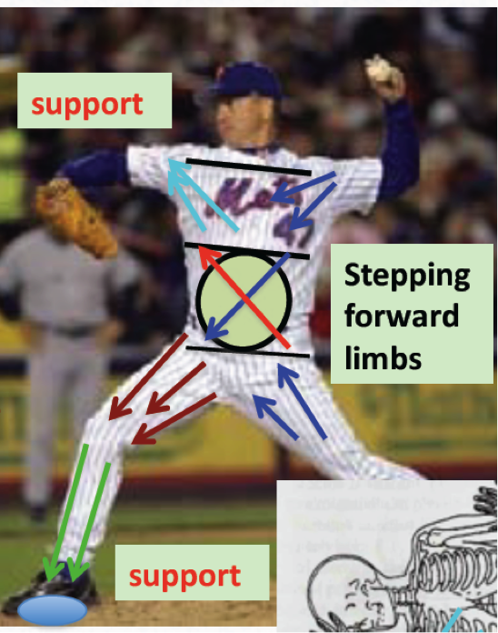 As you can see in the diagram below, when the pitcher is at the release point, his left arm is moving in space as well as the his left leg. The right leg is stabilizing into the ground and his right arm is stabilizing in space to create force production through our oblique chains of movement. As the left arm continues through the throwing motion, the right arm maintains stability against gravity to allow the left arm to follow through.