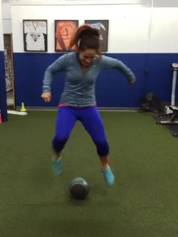 3. Quick feet to lateral hop – Stand next to a ball and run quickly in place. Plant the outside foot and push off jumping over the ball and landing on the opposite foot. This is basically a lateral bound where you jump over the ball pushing off the left foot and then landing on the right. Focus on landing and shock absorbing the impact by flexing your hip, knee and ankle. It is also important to keep your knee beneath your hip and not let in buckle inwards.