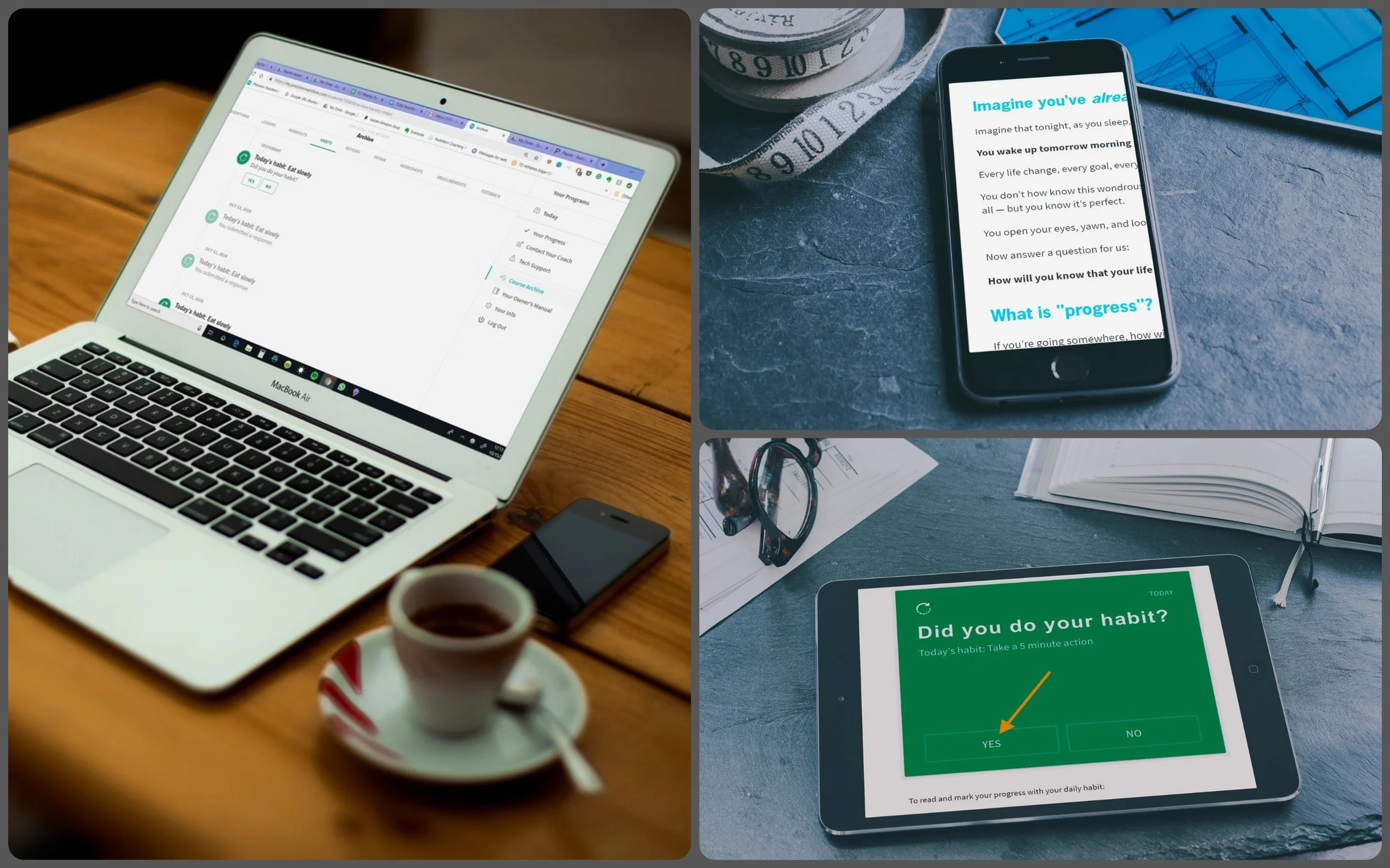 As you can see from the images below, you'll click on your daily habit indicating that ‘YES’ you made progress towards the habit or ‘NO’ you did not. You’ll also click either of the same options at the end of each lesson to indicate that you’ve read it. It's designed to be simple.